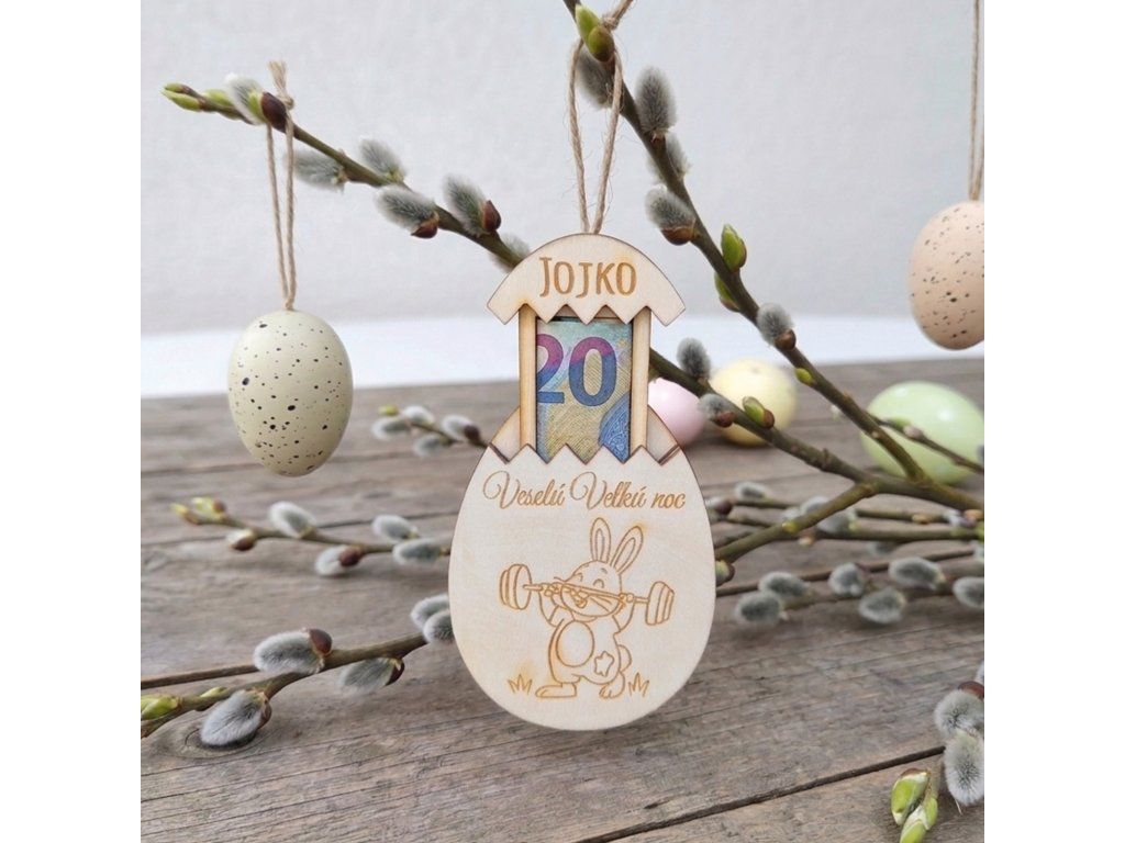 Originálna drevená obálka na peniaze v tvare veľkonočného vajíčka s gravírovaným motívom. Milý a kreatívny darček pre šibačov na Veľkú noc.