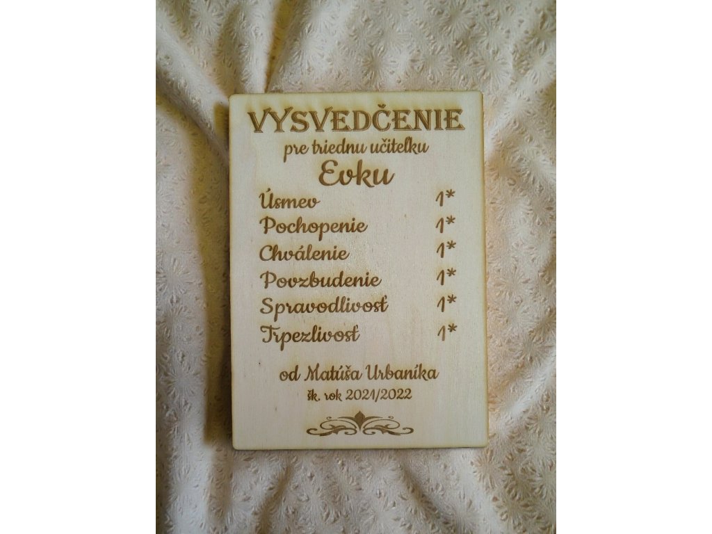 Drevené vysvedčenie pre pani učiteľku – personalizovaný darček